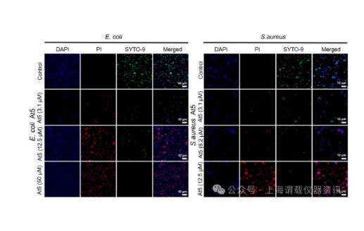 圖5、大腸桿菌和金黃色葡萄球菌在37°C下用不同濃度的At5肽處理2小時前后的活/死染色(×100放大倍數(shù),比例尺=10μm)。