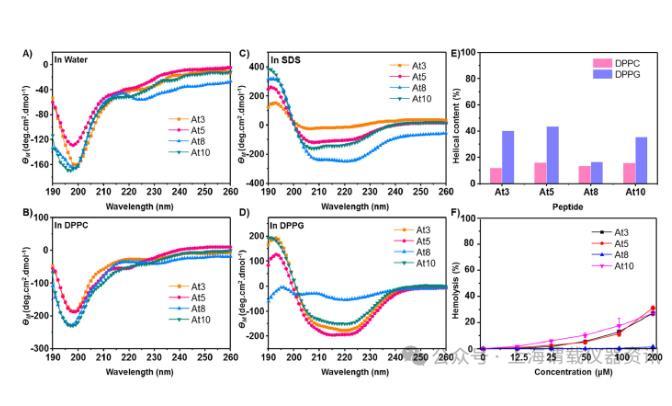 圖2、設(shè)計肽的二級結(jié)構(gòu)和溶血特性。(A)水、(B)25 mM SDS、(C)兩性離子DPPC SUV(0.25 mg mL-1)和(D)帶負(fù)電荷的DPPG SUV(0.25 mg mL-1)中肽的CD光譜。所有四種肽(At3、At5、At8、At10)在水和DPPC SUV中均呈現(xiàn)無規(guī)卷曲結(jié)構(gòu),而在SDS和DPPG SUV中均采用螺旋結(jié)構(gòu)。肽濃度固定在0.1 mM。所有測量均在室溫下進行。(E)DPPC和DPPG SUV中肽的α-螺旋含量。(F)肽的溶血活性。用不同濃度的肽處理人紅細(xì)胞(hRBC)并在37°C下孵育1小時。然后在OD540nm處測量吸光度。