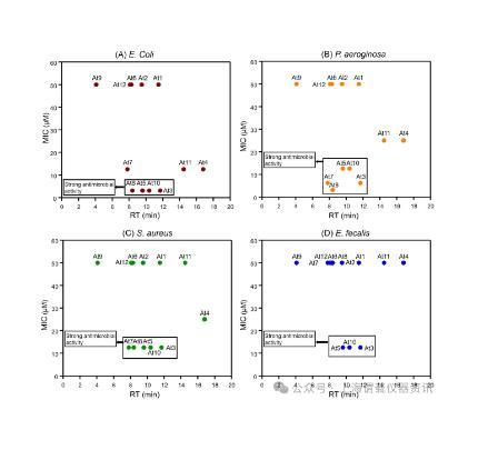 圖3、設(shè)計的抗菌肽的疏水性由它們的HPLC保留時間確定,與它們對不同菌株(A)大腸桿菌、(B)銅綠假單胞菌、(C)金黃色葡萄球菌和(D)大腸桿菌的抗菌活性之間的關(guān)系。
