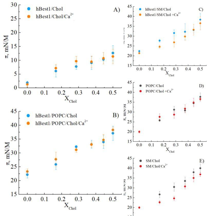 圖1.膽固醇對(duì)(A)hBest1、(B)hBest1/POPC、(C)hBest1/SM、(D)POPC和(E)SM單分子層的凝聚效應(yīng)(Chol的摩爾分?jǐn)?shù)為0.167;0.285;0.375;0.444和0.5)在存在或不存在Ca 2+的情況下,在35±2°C。數(shù)據(jù)表示為平均值±SE,n=7。