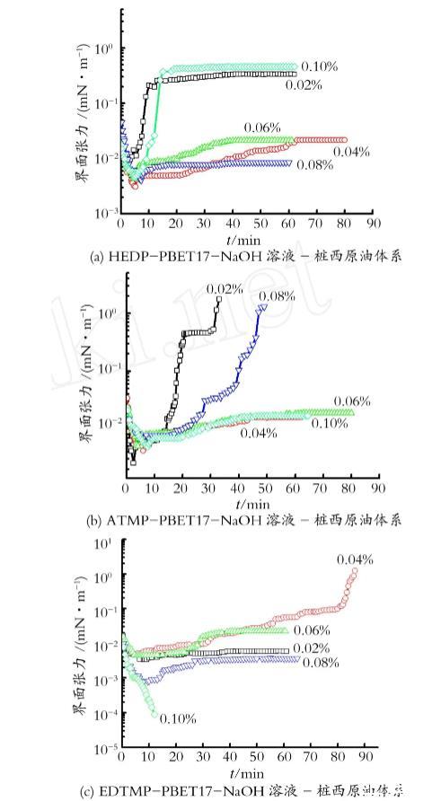 圖5 HEDP-PBET17-NaOH,A TM P-PBET17-NaOH,EDTM P-PBET17-NaOH溶液-樁西原油體系的動(dòng)態(tài)界面張力