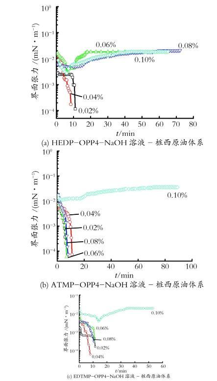 圖4 HEDP-OPP4-NaOH,A TM P-OPP4-NaOH,EDTM P-OPP4-NaOH溶液-樁西原油體系的動(dòng)態(tài)界面張力