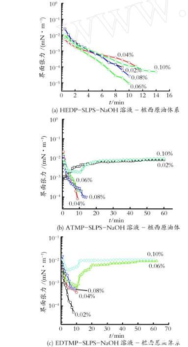 圖3 HEDP-SLPS-NaOH,A TM P-SLPS-NaOH,EDTM P-SLPS-NaOH溶液-樁西原油體系的動(dòng)態(tài)界面張力