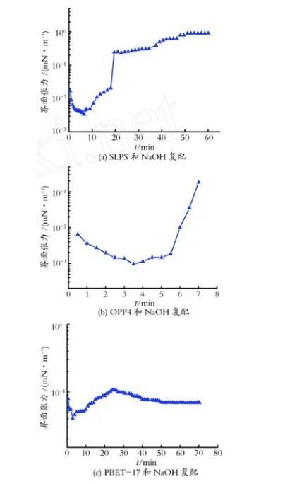 堿與表面活性劑復(fù)配有一定的協(xié)同效應(yīng),但使用高濃度堿容易引起結(jié)垢等問題,實(shí)驗(yàn)選用低濃度的NaOH(質(zhì)量分?jǐn)?shù)為0.1%)與SLPS、OPP-4和PBET-17進(jìn)行了復(fù)配,測(cè)定了其油-水動(dòng)態(tài)界面張力,如圖2所示。
