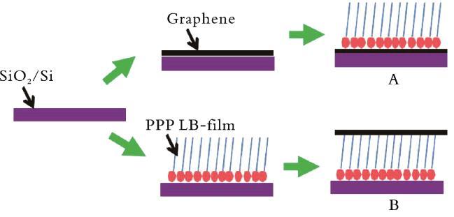 石墨烯作為一種新型二維超薄碳材料,易于吸附分子,是天然的襯底。當(dāng)某些分子吸附在石墨烯表面時(shí),分子的拉曼信號(hào)會(huì)得到明顯的增強(qiáng),這種拉曼增強(qiáng)效應(yīng)被稱為石墨烯增強(qiáng)拉曼散射效應(yīng)(GERS)。X.LING等為了進(jìn)一步證實(shí)GERS中的化學(xué)增強(qiáng)機(jī)制,使用LB技術(shù)構(gòu)建了原卟啉Ⅸ(PPP)的單層或多層有序聚集體以及與石墨烯接觸的PPP的可控分子構(gòu)型(見(jiàn)圖1)。