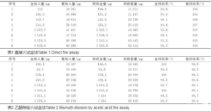表2結(jié)果為用乙酸除鉍火試金法,再進(jìn)行如表1的實(shí)驗(yàn),從表2可以看出金加標(biāo)回收率99.2%~101%,銀加標(biāo)回收率98.2%~99.7%,說(shuō)明已消除鉍的干擾,結(jié)果準(zhǔn)確可靠。
