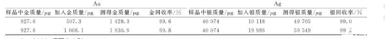 稱(chēng)取兩份2.0 g(精確至0.000 1 g,金含量463.8 g/t,銀含量20 037 g/t)粗鉍樣品,分別加500、1 000μg金和10 000、20 000μg銀,按照實(shí)驗(yàn)方法氧化、除鉍、火法富集,進(jìn)行分析,測(cè)得金銀含量和加標(biāo)回收率見(jiàn)表6。