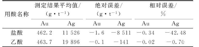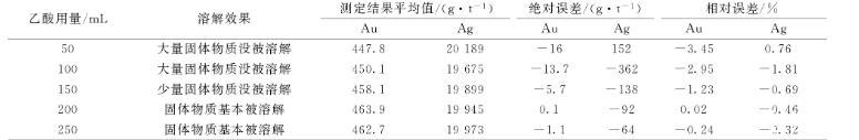 實(shí)驗(yàn)樣品金含量463.8 g/t,銀含量20 037 g/t,進(jìn)行除鉍用酸量的實(shí)驗(yàn),試驗(yàn)用酸為乙酸(1+1),結(jié)果見(jiàn)表5,從結(jié)果可以看出50、100 mL乙酸用量,大部分固體物質(zhì)沒(méi)被溶解,大部分鉍沒(méi)被除去,乙酸用量200 mL時(shí),固體物質(zhì)基本被溶解,結(jié)果較準(zhǔn)確,可以滿足測(cè)定要求。在結(jié)果準(zhǔn)確的情況下選擇用量少的,所以實(shí)驗(yàn)選擇乙酸用量為200 mL。