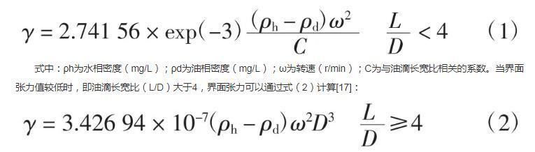 式中:ρh為水相密度(mg/L);ρd為油相密度(mg/L);ω為轉(zhuǎn)速(r/min);C為與油滴長寬比相關的系數(shù)。當界面張力值較低時,即油滴長寬比(L/D)大于4,界面張力可以通過式(2)計算:
