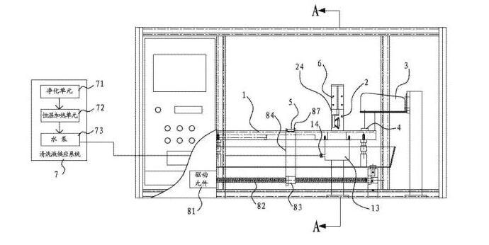 [0018]在一些實(shí)施方式中,還包括清洗液供應(yīng)系統(tǒng),清洗液供應(yīng)系統(tǒng)包括凈化單元、恒溫加熱單元和泵體。清洗液通過凈化單元凈化并通過恒溫加熱單元進(jìn)行加熱后,再經(jīng)由泵體供應(yīng)到清洗槽當(dāng)中。其有益效果是,先通過凈化單元,可以預(yù)先清除掉清洗液當(dāng)中可能存在的油。另外,通過恒溫加熱單元可以將清洗液加熱到一定的溫度。因?yàn)闇責(zé)釥顟B(tài)的清洗液,可以實(shí)現(xiàn)更加的油脂清除能力,從而可以將樣品上的油更方便且更完全的清洗下來。