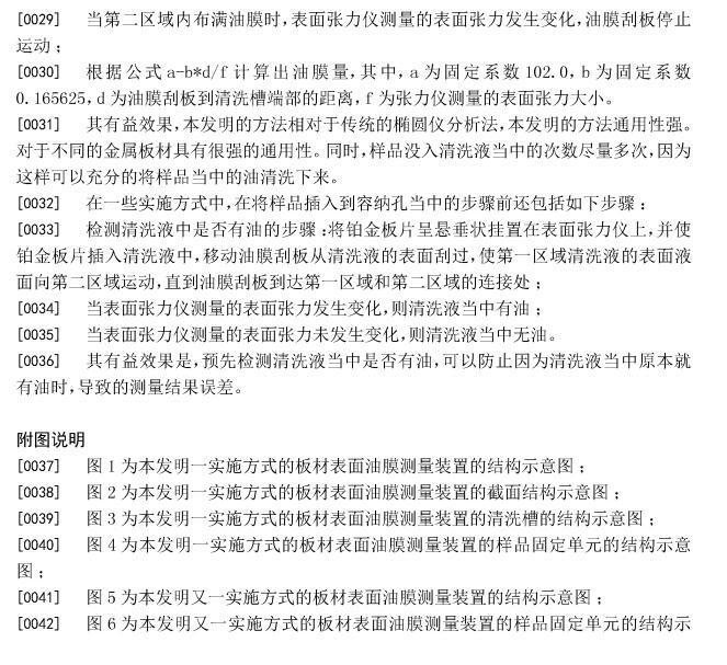 [0014]同時(shí)由于樣品固定單元是位于第一區(qū)域上方的,所以當(dāng)油清洗下來的時(shí)候,首先是在第一區(qū)域的清洗液面擴(kuò)散開來形成油膜。當(dāng)油膜刮板從第一區(qū)域的一端向著第二區(qū)域方向運(yùn)動(dòng)的時(shí)候,油膜就會(huì)向第一區(qū)域運(yùn)動(dòng),當(dāng)?shù)谝粎^(qū)域內(nèi)聚滿油膜的時(shí)候,表面張力儀就會(huì)通過鉑金板片感應(yīng)到清洗液表面張力的變化,此時(shí)油油膜刮板停止運(yùn)動(dòng),計(jì)算出整個(gè)油膜的面積。為了方便計(jì)算油膜的面積,可以在清洗槽的邊沿上設(shè)置相應(yīng)的刻度,同時(shí)將油膜刮板設(shè)置成與清洗槽的邊沿相垂直。最后根據(jù)公式a-b*d/f計(jì)算出油膜量,其中,a為固定系數(shù)102.0,b為固定系數(shù)0.165625,d為油膜刮板到清洗槽端部的距離,f為張力儀測(cè)量的表面張力大小。