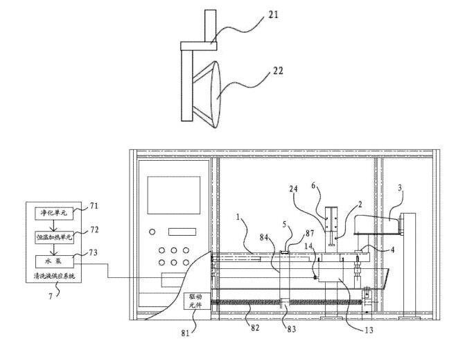 [0025]清洗液經(jīng)過凈化單元凈化并通過恒溫加熱單元加熱到30度到40度之間,經(jīng)由泵體供應(yīng)到清洗槽當(dāng)中;