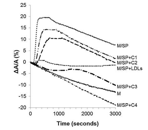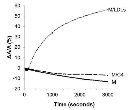 當(dāng)?shù)兔芏戎鞍着c牛精漿混合時 蛋白質(zhì)重量比為 10:1 (BSP:LDLs) 并注射到單層下方,單層的分子面積隨時間記錄 幾乎沒有變化(曲線 M/SP + LDL,圖 5)。 肩膀出現(xiàn)在 大約 400 s 揭示了 BSP 蛋白的弱吸附(這 肩部代表 M/SP 的 5%,上圖曲線)。 然后,該 1000s后分子面積的變化減少并穩(wěn)定。 不會像 M 和 M/SP 曲線的變化那樣減少, 表明 LDLs 成分的吸附,與 它們在界面處的高擴散能力(曲線 M/LDL,圖 4)。 因此,SP 中所含 BSP 蛋白在界面處的吸附 由于低密度脂蛋白而大大降低,并且 BSP/低密度脂蛋白的比率非常高 接近最佳值以完全防止 BSP 蛋白質(zhì)影響單層。 磷脂酰膽堿注射量 根據(jù)低密度脂蛋白的組成估計為 4.61 毫克 [33]。 因此,注射了 4.61 mg LDLs 的磷脂酰膽堿 26.6mg精漿蛋白質(zhì),即1mg精漿蛋白質(zhì)需要0.17mg磷脂酰膽堿。