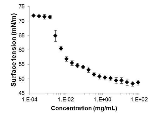 圖 2 牛氣水界面表面張力(±標(biāo)準(zhǔn)差) 精漿溶液中所含蛋白質(zhì)濃度的函數(shù) 提取并以對數(shù)刻度表示 (T = 23.2 ?C ± 0.3 ?C, n = 2, 4 次重復(fù) 每個樣品)。