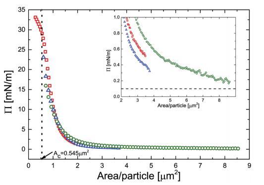 壓力面積等溫線是通過壓縮獲得 在朗繆爾槽上涂抹單層膜,用于 3 組不同的 實(shí)驗(yàn)。 這些等溫線中的區(qū)域坐標(biāo)被縮放 由吸附在界面上的顆粒數(shù)量決定。 一切 曲線折疊成單個(gè)圖,如圖 1 所示。 增加壓縮,壓力最初變化很小,但 每個(gè)顆粒低于 2 mm2,壓力會(huì)急劇增加。 曲線的斜率首先增加,但達(dá)到 最大在 ~27 mN m- 1 處有一個(gè)拐點(diǎn) 其次是稍弱的斜率。 面積值 對(duì)應(yīng)于該拐點(diǎn)的粒子 (Ac) 結(jié)果為 為 0.545 mm2,如圖 1 中的虛線所示。假設(shè) 顆粒緊密堆積,這對(duì)應(yīng)于~835 nm 的顆粒間距離,遠(yuǎn)大于 在本體中測(cè)量的顆粒的流體動(dòng)力學(xué)直徑 溶液 (590 nm) 表明顆粒確實(shí)是 大幅度變形。 如圖 1 的插圖所示,有限 0.5 mN m- 1 級(jí)的表面壓力(即遠(yuǎn)高于我們的 檢測(cè)限為 0.1 mN m- 1 ) 事實(shí)上已經(jīng)可以測(cè)量了 每個(gè)粒子的面積約為 4 mm2 . 插圖還表明 P 的絕對(duì)值可再現(xiàn)在 0.3 mN m- 1 以內(nèi) 在兩個(gè)不同朗繆爾的不同實(shí)驗(yàn)之間 槽。