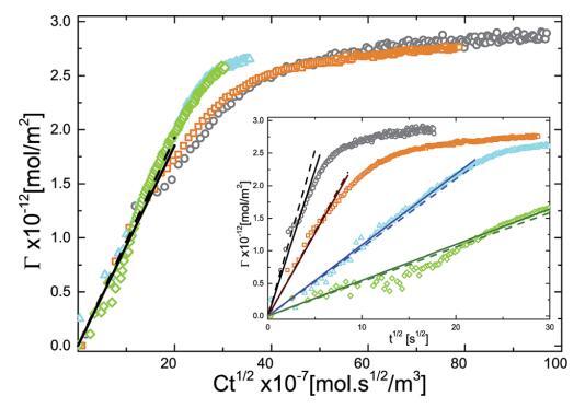 圖 5 吸附量 (G) 作為乘積 Ct1/2 的函數(shù)。 這 插圖顯示了不同體積的 G 與 t1/2 的單獨(dú)曲線 微凝膠顆粒濃度:(>)0.10 g l-1 , (D)0.20 克 l-1 , (,) 0.50 克 l-1 , (B)1.00 克 l-1 . 實(shí)線是直線擬合和虛線 用使用 D ? DDLS 計(jì)算的斜率繪制。