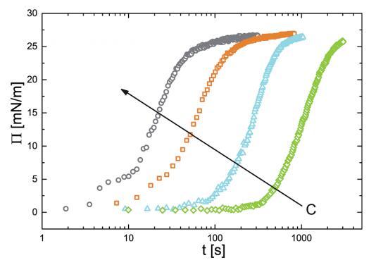 已經(jīng)建立了一個(gè)狀態(tài)方程來關(guān)聯(lián) 表面壓力和吸附量,我們現(xiàn)在繼續(xù) 研究顆粒的吸附動(dòng)力學(xué)。 為此我們 監(jiān)測(cè)新鮮的界面張力的演變 在 PNIPAM 顆粒懸浮液中制備氣泡作為 時(shí)間的函數(shù)。 我們轉(zhuǎn)換界面張力值 轉(zhuǎn)化為表面壓力。 結(jié)果如圖 4 所示。 表面壓力值最初迅速增加,然后 放松到最終的平衡值。 動(dòng)態(tài)可以一目了然 分為兩個(gè)獨(dú)立的時(shí)間尺度:初始快速 由表面壓力增加表示的動(dòng)力學(xué) 值,以及隨著系統(tǒng)向最終放松而緩慢的部分 平衡狀態(tài)。 快速動(dòng)力學(xué)之間的這種區(qū)別 短時(shí)間和長時(shí)間慢得多的動(dòng)力學(xué)是許多表面活性物質(zhì)的吸附行為的特征 材料.32,33