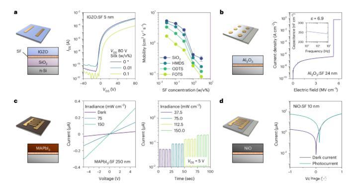 圖4展示了使用SF表面活性劑在憎水表面上制造水基納米器件的過程及其特性。研究發(fā)現(xiàn),SF的自分離特性在不影響器件性能的情況下,保證了薄膜的質(zhì)量和功能。在含有0.03 w/v%SF的IGZO晶體管中,遷移率保持在1至10 cm2/V·s之間,只有在SF濃度超過0.1 w/v%時(shí)才略有下降。即使在疏水性表面上,SF的存在也沒有顯著影響電荷遷移率或引起非理想狀態(tài)(圖4a)。在電介質(zhì)材料中,SF摻雜的Al2O3薄膜顯示出良好的電氣性能(圖4b)。SF還被成功應(yīng)用于制造基于MAPbI3和NiO的光電薄膜,這些薄膜在光照下產(chǎn)生光電流(圖4c,d)。相比商用表面活性劑,SF用量更少且對(duì)器件性能影響更小,并具有生物友好性,適用于生物活性傳感器和人機(jī)電子界面等領(lǐng)域,展示了在環(huán)保和經(jīng)濟(jì)效益上的優(yōu)勢(shì)。