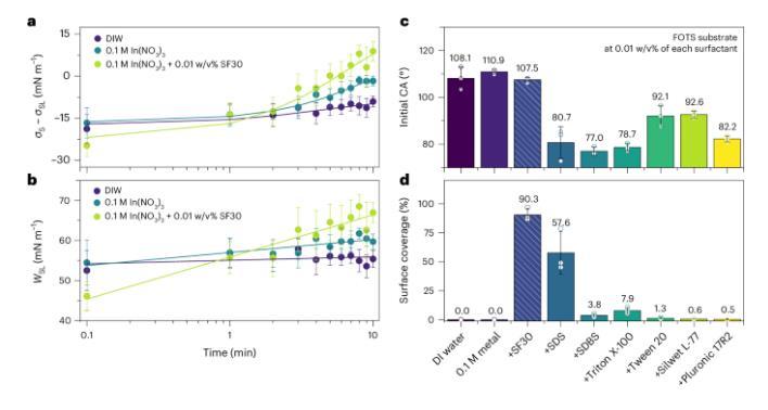 潤(rùn)濕是液體在固體表面擴(kuò)散以最小化自由能的現(xiàn)象,其效果通過界面張力和粘附功來定量評(píng)估。實(shí)驗(yàn)顯示,添加SF30(煮沸30分鐘的絲蛋白)到水溶液中,盡管表面張力與對(duì)照組相似,但顯著降低了疏水性基底上的接觸角(CA),表明潤(rùn)濕增強(qiáng)是由液固界面能的改變引起的,而非溶液表面能的變化(圖2a,b)。SF30通過多嵌段共聚物結(jié)構(gòu)的多樣性有效調(diào)控界面能量,增強(qiáng)了潤(rùn)濕效果,其水溶液在疏水性表面上的覆蓋率超過90%(圖2d)。與商用表面活性劑相比,SF30在控制疏水表面的潤(rùn)濕性方面表現(xiàn)更優(yōu),即使這些表面活性劑能有效降低溶液的表面張力(圖2c)。