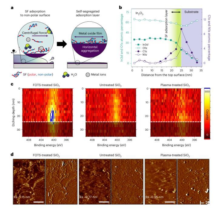 圖3a顯示了絲蛋白(SF)在不同表面能的基底上的吸附機(jī)制,假設(shè)疏水結(jié)構(gòu)域與非極性表面相互作用,而親水結(jié)構(gòu)域則面向溶液。作者通過X射線光電子能譜(XPS)和原子力顯微鏡(AFM)分析了摻有不同濃度SF的溶液在不同表面上的表現(xiàn)。XPS結(jié)果顯示,在非極性基底上,高濃度SF溶液形成了含有蛋白質(zhì)的薄膜,并且在高能離子轟擊下薄膜和基底界面上仍保留有N1s信號(hào)(圖3b,c)。AFM分析則揭示了不同基底上的表面拓?fù)浣Y(jié)構(gòu),非極性基底上呈現(xiàn)平躺形狀,而極性基底上則顯示島狀聚集體(圖3d)。研究表明,SF的吸附效率受表面能和分子量影響,并可有效增強(qiáng)潤(rùn)濕性。這一適應(yīng)性吸附機(jī)制有助于在不同表面上快速形成高質(zhì)量金屬氧化物薄膜,無需調(diào)整沉積參數(shù)。