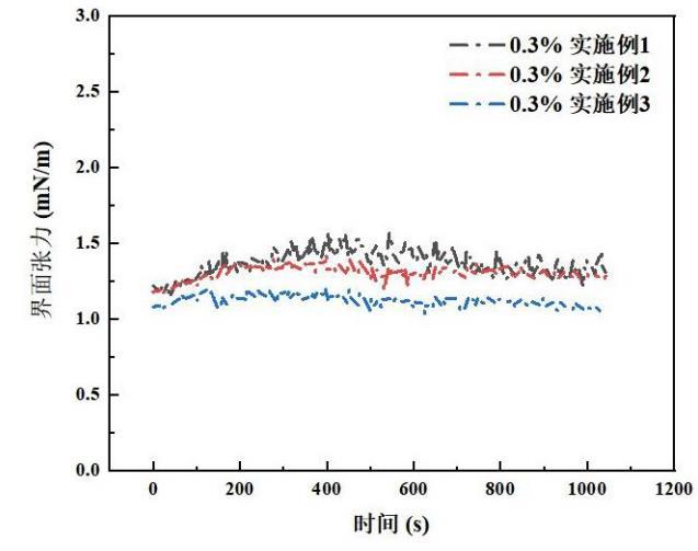 采用克呂士SDT旋轉(zhuǎn)滴界面張力儀分別測(cè)量原油(粘度723.7 mPa·s)滴入各實(shí)施例的地層水溶液后的界面張力(IFT),其中,各實(shí)施例在地層水中的質(zhì)量濃度為0.3%,并將原油滴入地層水中作為對(duì)照組進(jìn)行測(cè)量,測(cè)得對(duì)照組界面張力為21.6mN/m,其余各實(shí)施例測(cè)量結(jié)果如圖所示??梢钥吹剑团c三種實(shí)施例溶液混合后的體系的IFT可降低至1.25~1.46mN/m,證明了硅基納米原位乳化減阻劑具有良好的界面張力降低效果。