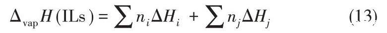 2008年,Verevkin[71]開(kāi)發(fā)了一種基于經(jīng)驗(yàn)公式的簡(jiǎn)單相加法來(lái)計(jì)算ILs的蒸發(fā)焓,該焓被分解為構(gòu)成元素的主要成分和輔助成分的校正(基于結(jié)構(gòu)上的特殊性,例如CF3基團(tuán)或環(huán)狀結(jié)構(gòu)的存在)