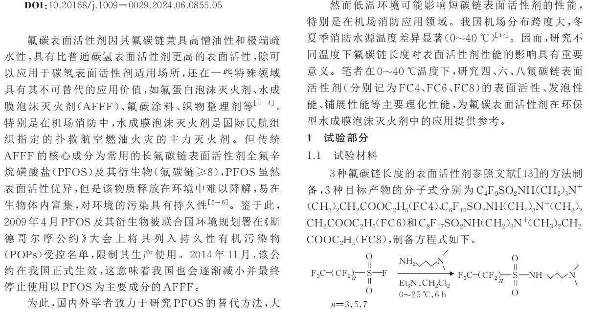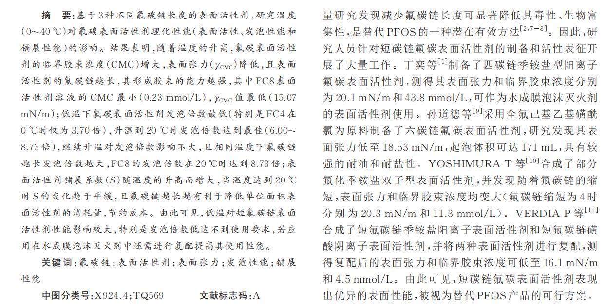 然而低溫環(huán)境可能影響短碳鏈表面活性劑的性能,特別是在機(jī)場消防應(yīng)用領(lǐng)域。我國機(jī)場分布跨度大,冬夏季消防水源溫度差異顯著(0~40℃)。因而,研究不同溫度下氟碳鏈長度對表面活性劑性能的影響具有重要意義。筆者在0~40℃溫度下,研究四、六、八氟碳鏈表面活性劑(分別記為FC4、FC6、FC8)的表面活性、發(fā)泡性能、鋪展性能等主要理化性能,為氟碳表面活性劑在環(huán)保型水成膜泡沫滅火劑中的應(yīng)用提供參考。
