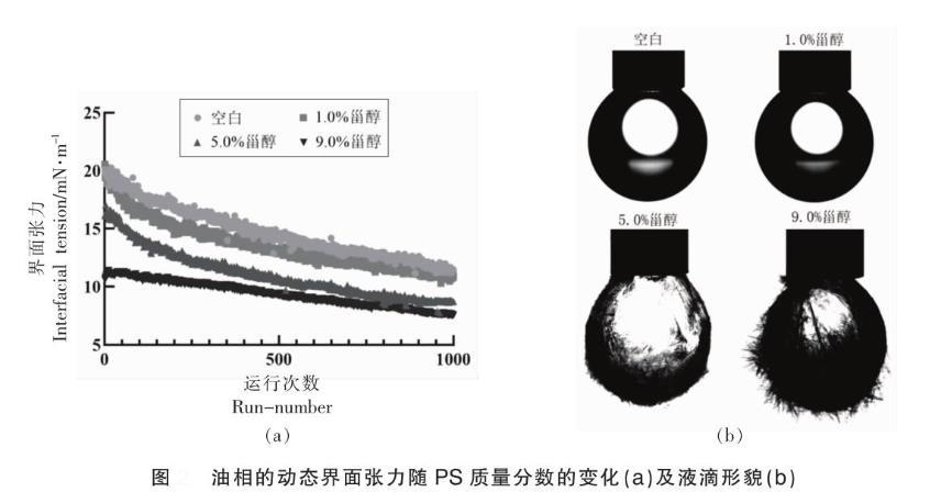首先,將連接在毛細管上的不銹鋼針(外徑為1.65mm)插人盛有油相的玻璃槽內。將針尖端放置在光源和相機(CCD)之間的光學平板上。然后用自動進樣單元將10μL的樣品推送至針尖上并形成完整的滴形。CCD攝像系統(tǒng)立即持續(xù)地采集液滴的外形輪廓變化,測試時維持油相溫度60℃,盡量避免外界振動的干擾。據Young-Laplace方程算出界面張力(精確至0.01mN/m)。
