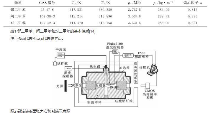 表面張力是流體重要的物性參數(shù),在化工生產(chǎn)過程和燃料噴射霧化中具有重要的作用。根據(jù)公開文獻(xiàn)調(diào)查發(fā)現(xiàn),鄰二甲苯、間二甲苯和對二甲苯的表面張力實驗數(shù)據(jù)的溫度范圍有限,且沒有給出可靠的計算方程,如鄰二甲苯和間二甲苯測量的實驗溫度范圍均為303.15——343.15 K,共14個實驗點,對二甲苯的實驗溫度范圍為296.037——333.92 K,僅有3個實驗點,大多數(shù)文獻(xiàn)只給出了常溫附近的單點值。另外,各研究人員的測量結(jié)果之間存在較大偏差,如鄰二甲苯的最大偏差超過1 mN·m-1,對二甲苯的最大偏差為0.84 mN·m-1,因此非常有必要對其表面張力開展進(jìn)一步的研究。本課題組開發(fā)出上述3種物質(zhì)的多參數(shù)Helmholtz狀態(tài)方程,可用于準(zhǔn)確計算氣液相區(qū)密度。