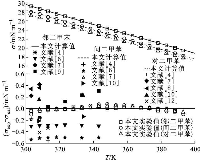 圖4鄰二甲苯、間二甲苯和對二甲苯表面張力與溫度關(guān)系以及與方程計算值和文獻(xiàn)值比較
