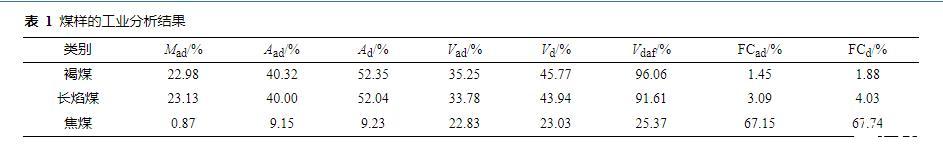 選取不同變質(zhì)程度的褐煤、焦煤及長焰煤,將煤樣放入球磨機(jī)中粉碎,并通過篩網(wǎng)過濾出粒徑在0.074 mm(200目)以上的煤粉,置于45℃真空干燥箱中干燥24 h后放入密封袋中低溫、避光保存。利用全自動工業(yè)分析測定儀對3種煤樣的水分、灰分和揮發(fā)分進(jìn)行測定,計算固定碳,其工業(yè)分析結(jié)果如表1所示。