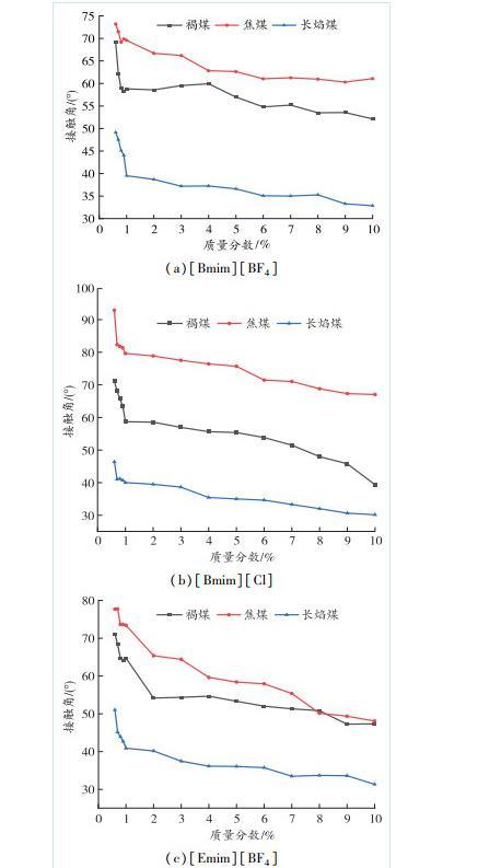 對于光滑的煤樣,離子液體對煤樣的潤濕程度采用接觸角作為評價指標(biāo)。3種煤樣的接觸角與不同離子液體質(zhì)量分?jǐn)?shù)之間的關(guān)系如圖3所示。