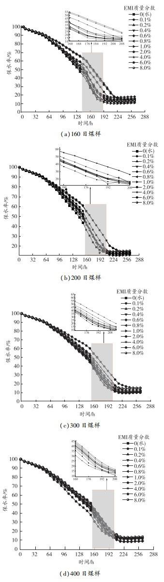 圖9不同質(zhì)量分?jǐn)?shù)EMI溶液中煤樣保水率變化曲線
