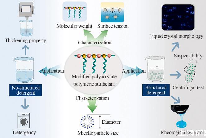 高分子表面活性劑,是指分子結(jié)構(gòu)中含有親水和疏水基團(tuán),且相對(duì)分子量在數(shù)千以上的化合物。與低分子量的表面活性劑相比,大部分高分子表面活性劑的表面活性較弱,滲透性和起泡性差,但分散、乳化以及絮凝等性能較好。因此,在織物洗滌劑中,高分子表面活性劑常常被用作聚合物。然而,不可否認(rèn),高分子表面活性劑在洗滌劑中時(shí),除了對(duì)黏度、去污力等表觀性能有影響外,其復(fù)雜的結(jié)構(gòu)和高分子量也會(huì)影響表面活性劑復(fù)配體系的微觀表現(xiàn):如膠束聚集行為、液晶形態(tài)等等。作為一種新型的特殊表面活性劑,探究高分子表面活性劑在洗滌體系中的應(yīng)用將有利于織物洗滌技術(shù)的革新。