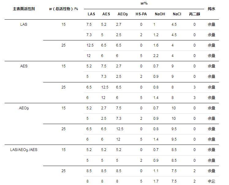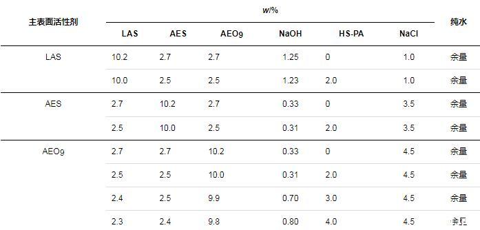 分別考察了在以LAS、AES和AEO9為主要表面活性劑的體系中,HS-PA作為改性聚丙烯酸/酯高分子表面活性劑可發(fā)揮的增稠以及去污效果。在配方設(shè)計上,總活性物質(zhì)量分?jǐn)?shù)約為15%。由于HS-PA的增稠作用需要和NaCl協(xié)同起效,而不同配方的耐鹽性不同,因此,根據(jù)空白組(無HS-PA)配方黏度不反稀的NaCl用量,來確定同組樣品(含HS-PA)的NaCl用量,具體配方如表1所示(表中LAS、AES已換算為純質(zhì)量分?jǐn)?shù),HS-PA(w=30%)未換算)。