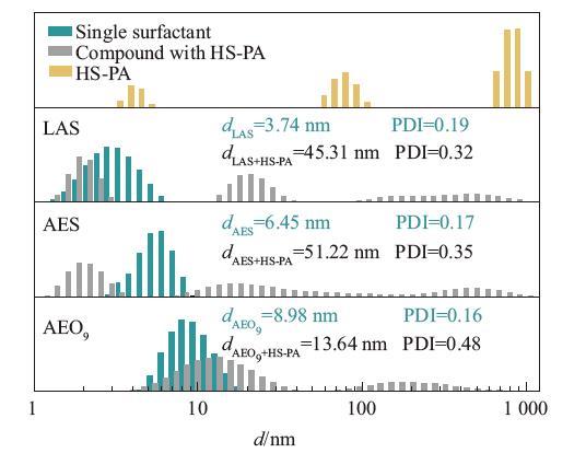 為了探究高分子表面活性劑在水溶液中聚集行為,考察了常規(guī)表面活性劑與HS-PA復(fù)配前后的膠束粒徑變化。由圖3的結(jié)果可知,3種低分子量表面活性劑的聚集體尺寸及分布情況比較相似,其粒徑均小于10 nm,呈現(xiàn)出單峰分布。LAS、AES和AEO9的平均膠束粒徑分別為3.74,6.45和8.98 nm。PDI越大,說明其粒徑分布越寬,高分子表面活性劑HS-PA的PDI大于0.5,其粒徑情況不適合用平均粒徑值表示,因此未在圖中提供平均粒徑的數(shù)據(jù)。從圖3中HS-PA的粒徑分布情況可以看出,其聚集體為多峰分布,且分布較寬。粒徑為3~5 nm的聚集體可能是HS-PA的單分子膠束。與低分子量表面活性劑不同,在稀溶液中,高分子表面活性劑結(jié)構(gòu)中的疏水鏈段傾向于聚集,分子卷縮,可自身形成單分子膠束,該現(xiàn)象曾被許多研究報道。粒徑為50~110 nm以及650~1 000 nm的為HS-PA的有序多分子聚集體,如膠束、小囊泡等。HS-PA分子量大,分子中的疏水鏈段和親水鏈段長,導(dǎo)致其有序多分子聚集體的粒徑明顯比低分子量表面活性劑大。