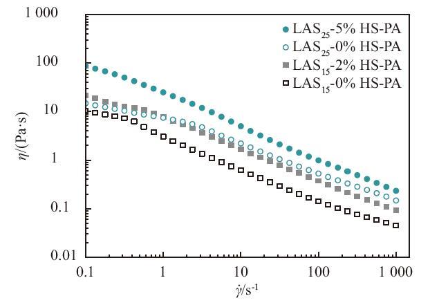 圖7為不同配方洗滌劑的表觀黏度隨剪切速率變化曲線,隨著剪切速率不斷增加,4個樣品的表觀黏度均逐漸減小,表現(xiàn)出剪切變稀的非牛頓流體行為。在恒定剪切速率下,體系中加入HS-PA將提高洗滌劑的黏度。結(jié)合偏光顯微鏡圖像可知,HS-PA的加入使得分子空間堆積構(gòu)型發(fā)生改變,體系中出現(xiàn)更多的球形層狀液晶,液晶結(jié)構(gòu)越多越完整,則說明其形成的聚集體中,分子排布越緊密且越有序,層間發(fā)生滑動時越困難,宏觀表現(xiàn)為黏度越大。當(dāng)無HS-PA影響時,在相同剪切速率下,活性物質(zhì)量分?jǐn)?shù)越高,黏度越大。這可能是因為活性物質(zhì)量分?jǐn)?shù)越大,表面活性劑分子之間作用力越強,分子鏈發(fā)生相對運動時的阻礙效果越明顯,黏度則越大。
