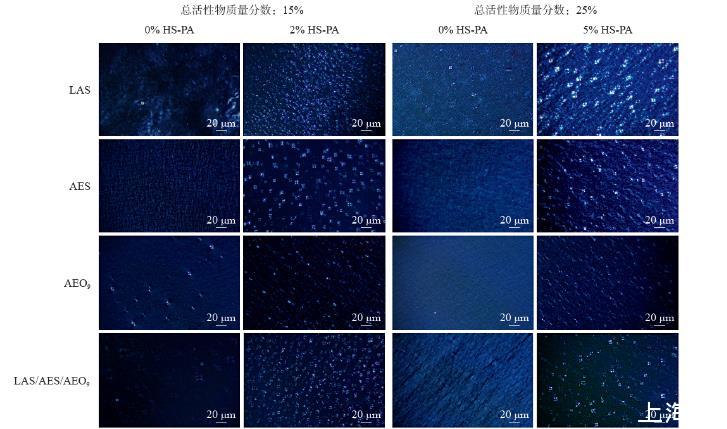 圖5為結(jié)構(gòu)型洗滌劑的偏光紋理圖(表2中的配方,以“主表面活性劑—總活性物質(zhì)量分?jǐn)?shù)—HS-PA質(zhì)量分?jǐn)?shù)”區(qū)分)。從圖中可以明顯看出,在分別以LAS、AES和AEO9為主表面活性劑的配方中,當(dāng)總活性物質(zhì)量分?jǐn)?shù)約為15%或者25%時,加入HS-PA后,偏光圖像中的馬耳他十字液晶形狀均明顯增多。馬耳他十字是球形層狀液晶的典型織構(gòu),說明了HS-PA的加入有利于體系形成球形層狀液晶。當(dāng)體系中不含HS-PA時,偏光視野并非完全暗場,而是有微弱的油狀條紋或者少量的馬耳他十字,表明其中也具有部分平面或者球形層狀液晶結(jié)構(gòu),但液晶較弱。不同主表面活性劑的層狀液晶結(jié)構(gòu)存在一些區(qū)別,AEO9為主表面活性劑的配方,其十字花紋理直徑為2~3μm,小于LAS、AES以及三元表面活性劑平衡體系的十字花紋理直徑(7~10μm)。以上結(jié)果與HS-PA復(fù)配體系中的粒徑分布變化相吻合:當(dāng)HS-PA與低分子量表面活性劑復(fù)配時,LAS/AES與HS-PA的混合膠束粒徑明顯變大,但AEO9與HS-PA的混合膠束粒徑只略微變大。根據(jù)球形層狀液晶的結(jié)構(gòu)可知,其內(nèi)部混合膠束粒徑越大,則相應(yīng)的液晶粒徑越大。對于除AEO9外的其他3種體系而言,總活性物質(zhì)量分?jǐn)?shù)從15%提高到25%,HS-PA加量從2%增加至5%,球形層狀液晶的粒徑會相應(yīng)增大,此現(xiàn)象在LAS為主表面活性劑以及LAS較多的三元表面活性劑平衡體系中更為明顯。