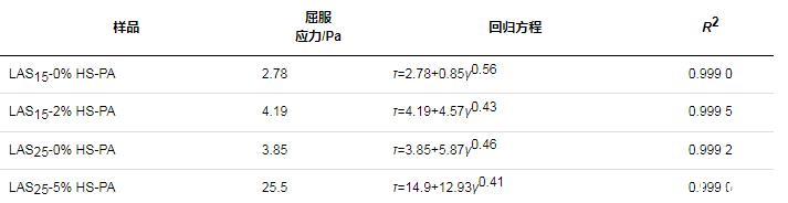 根據(jù)Herschel-Bulkley模型擬合的回歸方程及流變參數(shù)如表5所示(命名規(guī)則:主表面活性劑總活性物質(zhì)量分?jǐn)?shù)-HS-PA用量),其中擬合曲線相關(guān)系數(shù)(R2)均不小于0.999,相關(guān)性較高,表明LAS體系的流變性可以利用Herschel-Bulkley模型進(jìn)行研究。在活性物質(zhì)量分?jǐn)?shù)為15%的體系中添加2%HS-PA,屈服應(yīng)力從原先的2.78 Pa提高至4.19 Pa,在25%活性物配方中加入5%HS-PA,屈服應(yīng)力由3.85 Pa提高至25.5 Pa,說明HS-PA的添加可以提高體系的屈服應(yīng)力。屈服應(yīng)力是指液晶結(jié)構(gòu)破壞時的臨界剪切應(yīng)力值。由前文研究結(jié)果可知,HS-PA的加入使配方獲得更多更致密的球形層狀液晶,因此,相應(yīng)地,體系屈服應(yīng)力也越大。而屈服應(yīng)力越大,當(dāng)體系中包含水不溶粒子(如微膠囊)時越容易穩(wěn)定,該結(jié)果與離心測試結(jié)果相契合。