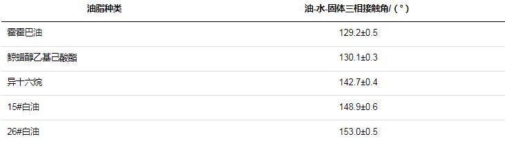 以不同極性的油脂為油相制備了一系列的Pickering乳液,圖2是不同油脂得到的W/O型Pickering乳液的表觀照片、微觀圖像及粒徑分布圖,可以看出,不同油脂得到的Pickering乳液粒徑具有較大的差異,粒徑大小順序?yàn)榛艋舭陀停?.45μm)<鯨蠟醇乙基己酸酯(8.66μm)<異十六烷(17.46μm)<15#白油(18.20μm)<26#白油(24.53μm),極性油脂制備的Pickering乳液的粒徑較小,且極性越大,Pickering乳液的粒徑越小,而非極性油脂制備出的乳液的粒徑較大,這是由于油相的極性會(huì)影響油-水-固體三相接觸角(見(jiàn)表1),油相的極性越大,油-水-固體三相接觸角越接近于90°,乳液的粒徑越小。
