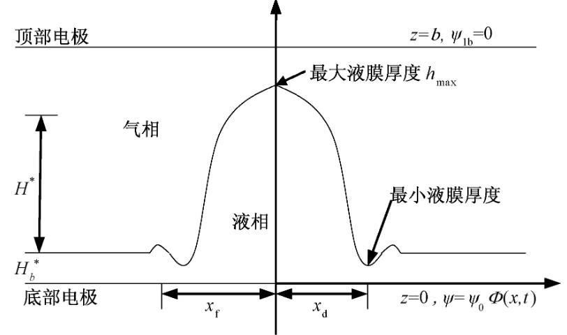 上述研究表明,電場(chǎng)強(qiáng)度對(duì)表面張力的影響大致分為表面張力隨電場(chǎng)強(qiáng)度提高而減小、增大和不變等三種情形。而目前對(duì)于受電場(chǎng)作用時(shí)的液滴運(yùn)動(dòng)的理論研究中,均假設(shè)表面張力不受電場(chǎng)影響,即表面張力不變,進(jìn)而模擬其運(yùn)動(dòng)特征;這顯然與上述多數(shù)實(shí)驗(yàn)所得結(jié)論明顯不符,也不能準(zhǔn)確反映電場(chǎng)對(duì)液滴運(yùn)動(dòng)的影響。為此,本文基于實(shí)驗(yàn)研究結(jié)果,建立表面張力與電場(chǎng)強(qiáng)度間的關(guān)系式,推導(dǎo)電場(chǎng)作用下描述液滴運(yùn)動(dòng)過(guò)程的演化方程,采用數(shù)值模擬獲得不同電場(chǎng)情形下的液滴運(yùn)動(dòng)行為,進(jìn)而分析因電場(chǎng)作用帶來(lái)的表面張力變化對(duì)液滴運(yùn)動(dòng)特征的影響。