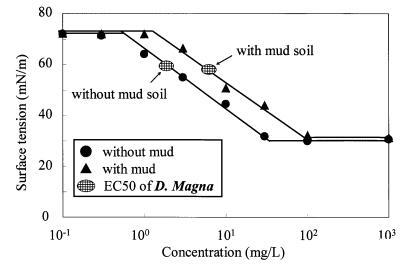 圖 12 泥土存在對地表的影響 AE和有毒表面張力的張力曲線 Daphnia Magna 的價值。