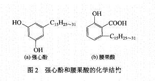 從圖1可以看出,兩種生物質(zhì)腰果酚磺酸鹽的收率隨著反應(yīng)溫度的升高先增加隨后變化較緩,而活性物含量先增大后減小。在磺化溫度為25℃時(shí),不飽和腰果酚磺酸鹽和飽和腰果酚磺酸鹽的活性物含量達(dá)到最大值,分別為84.0%和98.7%,此時(shí)收率也較高,分別為85.0%和88.9%。當(dāng)磺化溫度高于25℃時(shí),兩種腰果酚磺酸鹽的活性物含量降低,收率變化較小。分析原因可能為,磺化溫度太高,會導(dǎo)致過磺化,生成的副產(chǎn)物水溶性較差,導(dǎo)致活性物含量較低。在相同條件下,飽和腰果酚磺酸鹽的收率和活性物含量高于不飽和腰果酚磺酸鹽,這主要是由于不飽和腰果酚中含有一定量的雜質(zhì)強(qiáng)心酚和腰果酸,結(jié)構(gòu)見圖2。這兩種物質(zhì)的結(jié)構(gòu)與腰果酚的結(jié)構(gòu)相似,分離難度較大;且這兩種物質(zhì)也發(fā)生磺化反應(yīng),導(dǎo)致不飽和腰果酚磺酸鹽的活性物含量較低。然而通過對不飽和腰果酚進(jìn)行側(cè)鏈加氫生成飽和腰果酚后,物理性質(zhì)發(fā)生變化,飽和腰果酚為棕色固體,強(qiáng)心酚和腰果酸為液體,很容易分離。因此,飽和腰果酚磺酸鹽的活性物含量高于不飽和腰果酚磺酸鹽。