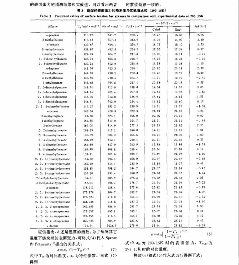 對Davis和Rosseinsky提出的關(guān)系檢驗表明,液體的表面張力σ與P1Vm1/3之比不僅取決于溫度,還與液體的種類有關(guān),據(jù)此,建立了一個能由鏈烷烴的分子結(jié)構(gòu)準(zhǔn)確預(yù)測其表面張力的方法。