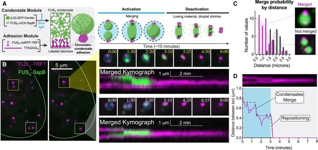 通過局部藍(lán)光激活,凝聚體可以在標(biāo)記的位點(diǎn)上被誘導(dǎo)形成。在持續(xù)光激活下,錨定到兩個(gè)相鄰染色質(zhì)位點(diǎn)的凝聚體會(huì)生長并融合為一個(gè),并與目標(biāo)位點(diǎn)保持關(guān)聯(lián)。在去激活后,凝聚體收縮產(chǎn)生拉力,導(dǎo)致這些位點(diǎn)重新定位(圖1A)。這種方法能使端粒成功地在多個(gè)微米的核空間內(nèi)重新定位。然而,如果位點(diǎn)之間的距離超過2