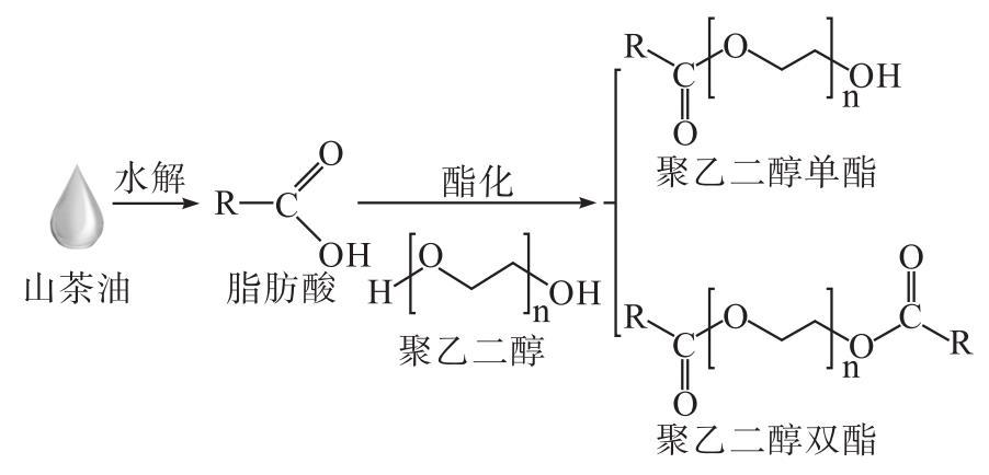 為了解決上述問題,本文以聚乙二醇600(PEG600)和山茶油水解產(chǎn)物為原料,通過水解-酯化兩步法制備改性山茶油,并對其各項性能指標(biāo)進行評價,為山茶油在水劑型化妝品中的應(yīng)用提供數(shù)據(jù)支持。改性山茶油的制備原理如圖1所示。