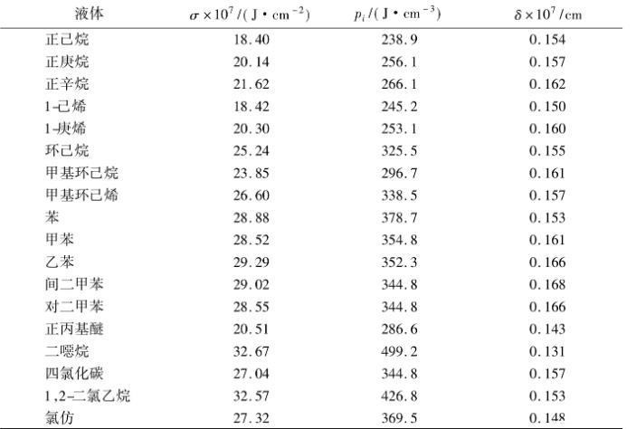 表1 293.15K時(shí)若干液體的表面張力、內(nèi)壓力和表面層厚度