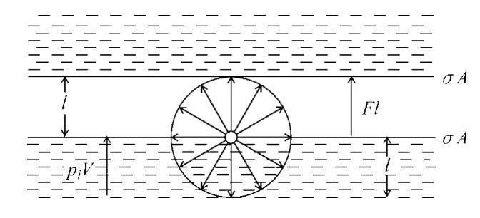 式中pi=(?U/?V)T是內(nèi)壓力的熱力學(xué)定義,式(5)便是本文所得結(jié)果。由此可見,表面張力與內(nèi)壓力的關(guān)系是很簡(jiǎn)單的,它不僅說明了縱向作用的內(nèi)壓力與表面上橫向作用的表面張力成正比,而且還能說明圖1所示的力學(xué)類比。圖3是該說明的示意圖。