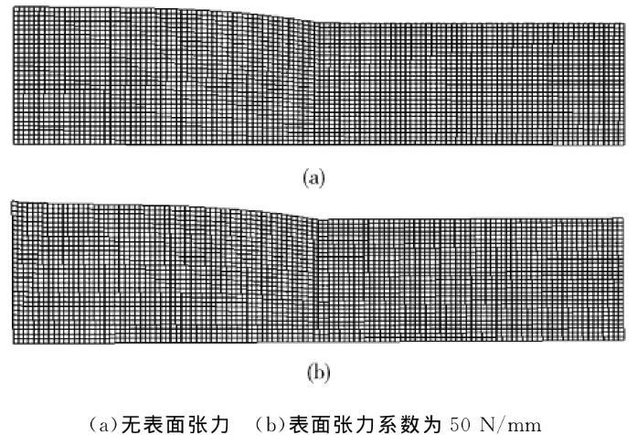 AE=1.2mm時,表面張力系數(shù)為零和表面張力系數(shù)為50N/mm時的網(wǎng)格變形如圖4所示。從圖4可以看出,有表面張力和沒有表面張力的時候,網(wǎng)格的變形并沒有太大的區(qū)別,只是網(wǎng)格的變形量略微有些不同。說明有表面張力的時候,自由表面的形變方式并沒有很大的變化。但在自由表面出口處的變形非常明顯。這說明表面張力對微擠出自由表面出口處的流場影響很大。這是因為自由表面出口處的邊界條件突然變化,從而導(dǎo)致表面張力在此處的作用效果有較大變化。