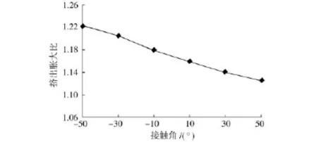 表面張力系數(shù)為50N/mm時,接觸角取值:-50°~50°。數(shù)值模擬計算得到的擠出脹大比值如圖6所示。